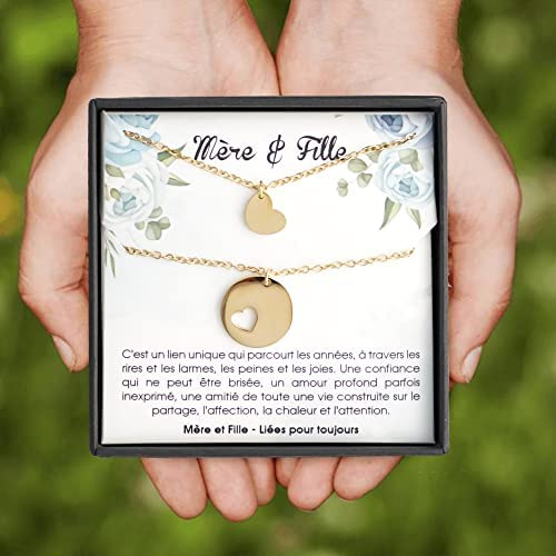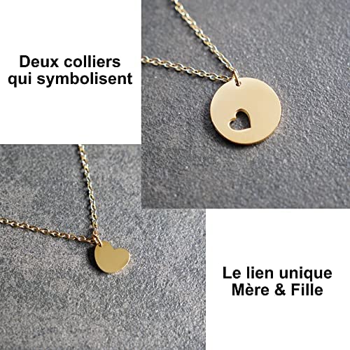The round necklace with a cut-out heart is complemented by a heart-shaped necklace, symbolizing the unity and a mother’s love for her daughter.