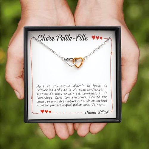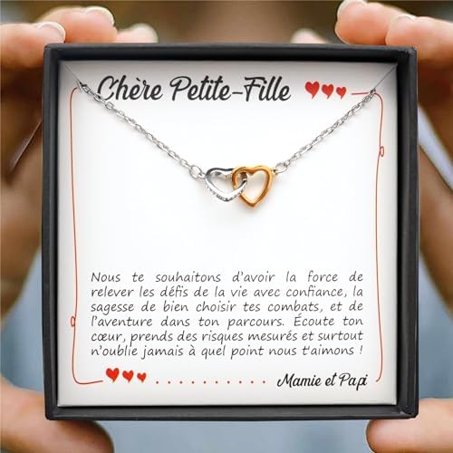 Un joli collier personnalisé en forme de coeurs avec unemessage d’Amour pour petite-fille signé Mamie et Papi .C’est un cadeau très merveilleux et étonnant, le message contient de jolis mots et exprime l’amour avec de beaux vœux pour le petite.Livré dans une belle boîte cadeau.La chaîne est de couleur argent brillant. Les deux petits cœurs brillent fait en acier chirurgical poli et lepierres de zircone cubiques et sont magnifiquement conçus de manière artistique.Je l ‘ai beaucoup aimé et je le recommande comme un merveilleux cadeau.