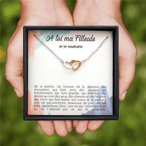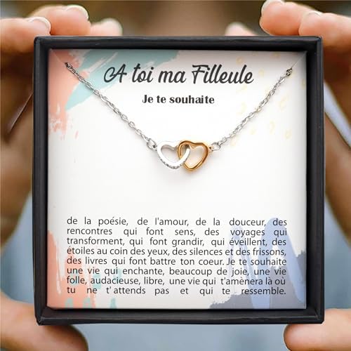Très beau collier cœurs entrelacés en argent sterling.Fermoir épais résistant.Belle longueur de chaine, avec rallonge.Cœurs sertis de petites pierres, bicolores.Prix mini moins de 25 euros.Excellente idée cadeau.Parce qu’une marraine a un lien et un rôle spécial ce collier reflète bien le lien d’une marraine et de sa filleule.